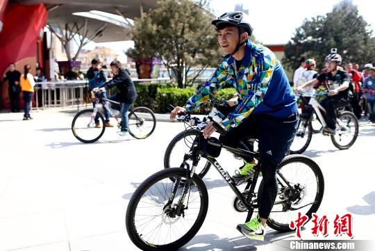 3月29日,全能艺人大左(前)与来自北京高校的七支骑行队伍于上午11点共同抵达北京欢乐谷,并进入园区开展首届“自造蓝天、绿色骑行”特别公益活动。为艺人大左在骑行中。中新社发陆欣 摄 当日是“地球一小时”活动日,来自清华、北大、人大等11所高校200名大学生组成七支队伍,从海淀、昌平、房山等方向骑行至北京欢乐谷,途径鸟巢、国家大剧院、水立方、三里屯、国贸等地标区域,以骑行创意方式为北京的蓝天向市民倡导绿色环保行动。 |