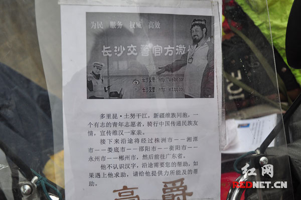 (长沙市公安局交警支队的工作人员在多里昆·土努干江的摩托车挡风玻璃上贴的爱心呼吁告示)
