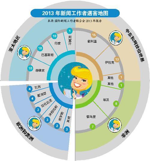4日,两名报道阿富汗总统大选的美联社女记者遭枪击,一死一伤。在战乱地区,记者在工作时遭杀害并不算什么稀罕事。有数据统计,在过去的5年间,每年在工作中遇害或者意外死亡的记者超过百人。而且,由于这份职业的特殊性,新闻工作者在某些国家与地区日益成为恐怖分子和武装分子的焦点目标。这些有着“无冕之王”美誉的记者们的敬业和牺牲更凸显了新闻事业的严肃与神圣。在这样一个特殊的节日里,让我们向这些为新闻献身的记者致以最高的敬意。文字:鹏致 每年逾百记者 因工作殉职 数据显示,过去5年来,每年在履行自己的职责时遭到杀害或者遇到意外殉职的新闻工作者都超过100人,新闻记者是个“高危职业”的说法由来已久,投身于战争战乱报道的战地记者和在动荡地区从事报道的记者更经常受到生命威胁。 每年,几个不同的非政府组织(以保护记者权益为目的)都会给出他们的数据,统计上一年度殉职的新闻工作者人数,呼吁全球关注记者的人身安全问题。去年12月31日,西方最大的记者组织国际新闻工作者联合会公布数据称,2013年全世界约有105位记者和媒体工作者在履行职责时遭到杀害,另有15人在工作时遇到意外死亡。许多死亡事件发生在战斗期间,但也有多个记者在披露敏感问题后遇害。 国际新闻工作者联合会的网站上显示,该组织代表134个国家和地区的60多万名新闻工作者。该组织统计的死亡人数包括了媒体工作者,如电影剧组成员和节目主持人。 记者成为恐袭目标 包括国际新闻工作者联合会在内的不少机构都表示,统计出来的殉职者人数只来自该机构记录在案的记者和媒体工作者,不排除遗漏,“没有机构敢肯定地说他们统计了所有(殉职者)”。 就去年的记者殉职现象,总部设在纽约的保护新闻工作者协会副会长罗伯特·马奥尼发表声明说:“中东已成为记者的坟墓。虽然因公殉职的记者人数在一些地区有所减少,但是叙利亚内战和重新出现的伊拉克教派冲突事件都造成了巨大伤亡。国际社会必须说服各国政府和军队,尊重记者的平民身份,并起诉杀人凶手。” 媒体权利监督机构“无国界记者”组织去年12月则表示,2013年有71名记者被杀害,比去年稍有下降,但对记者的绑架事件出现了明显上升。 与以前可能大多是在战乱或者冲突地区意外遇难不同,近几年来新闻工作者成为了某些恐怖组织或武装分子特意瞄准的目标。国际新闻工作者联合会发布的《致命危险:2013年殉职的记者和媒体工作者》报告称,新闻工作者日益成为一些恐怖组织和武装分子的特定目标。例如法国女记者吉斯兰娜·杜邦和技术员克劳德·维尔隆在马里遭到“基地”组织一分支枪杀,伊拉克提克里特的萨拉哈丁电视频道在2013年12月遭到了反政府武装的袭击,5名记者和雇员遇害。在叙利亚,一些武装力量为了控制话语权和引导舆论,也将枪口转向了新闻工作者。 去年,不少媒体蜂拥至埃及报道其国内动荡政局,也令得这里成为记者遇袭的高发地。在埃及工作的不少记者在姓名、地址被一些媒体刊出后,担心有生命危险而被迫隐姓埋名地躲藏起来。 国际新闻工作者联合会在2013年的报告中还特意提到,相比同在亚太地区的巴基斯坦、印度和菲律宾三国,阿富汗去年只有1名记者遇害,比过去几年的统计数据有所减少,这显示该国变得更为安全了。但此次美联社两位女记者的遇袭事件表明,阿富汗仍然是记者人身面临威胁的“重灾区”。 女记者 面临威胁更甚 国际新闻工作者联合会在报告中称,女记者正面临更为严重的暴力。2013年有6名女记者死于非命,还有许多女记者成为性暴力和性胁迫的受害者。 对于女新闻工作者来说,在动荡国度或者充斥着腐败和暴力的地区进行报道,面临着巨大的危险。国际新闻工作者联合会表示,女记者们的安全风险正日益变大。虽然2013年殉职的105名记者中只有5名为女性,另有一人是在采访过程中遇意外身亡,但这一数据产生的原因很可能只是源于大多数媒体认为男记者更适合被派往动荡地区的思维定势。 对于女记者来说,在安全方面可能会面临与男记者不太一样的威胁,例如,女记者在到外国报道国际新闻事件时,甚至可能遭到被访者或者熟人的性侵犯。该组织举例说,在埃及,女性新闻工作者在对示威抗议活动进行采访报道时,最容易遭到性侵犯。而负责本地新闻采写的女记者则可能出现家庭私生活遭到暴力威胁的情况,例如在某些案例中,敌对方通过损害女记者的名声来达到降低其报道可信度的目的。 近两年殉职的部分女记者 索马里女记者阿卜杜卡迪尔 埃及女记者哈比巴·阿布德拉齐兹 叙利亚女记者亚拉·阿巴斯 法国女记者吉斯兰·杜邦日“战地美女记者”山本美香 去年3月24日,年仅21岁的女记者阿卜杜卡迪尔在索马里首都摩加迪沙的街头遭人射杀,这已经是2013年该国武装分子针对新闻工作者的第三次暗杀行为了。阿卜杜卡迪尔生前是索马里一家电台的记者,她的工作重点是关注人权,特别是妇女权益。她在工作完毕返回家中的路上遇害,两名持枪男子瞄准她射击,目击现场的同事说,她被射中5枪。 埃及女记者哈比巴·阿布德拉齐兹 去年8月14日,埃及安全部队在清理被罢黜总统穆尔西支持者抗议中,与抗议者发生暴力冲突,导致4名记者遇难,多名媒体人受伤。遇难记者中就有一名年轻的女记者,26岁的哈比巴·阿布德拉齐兹为迪拜