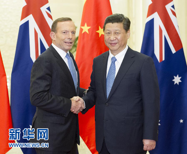 4月11日,国家主席习近平在北京人民大会堂会见澳大利亚总理阿博特。 新华社记者黄敬文摄 习近平表示,你这次率庞大代表团访华,体现了澳大利亚政府及各州区、各界对发展中澳关系的重视和诚意。中澳两国都是亚太地区重要国家,拥有广泛而重要的共同利益,合作潜力巨大。中方愿意同澳方一道,推动中澳战略伙伴关系持续向前发展。双方要保持密切高层交往和各级别沟通对话,增进政治互信,加快双边自由贸易协定谈判,希望澳方为中国企业在澳投资经营提供良好条件。双方还要推进两军、打击跨国犯罪、人文等领域交流与合作,加强在多边领域协调与配合,共同应对气候变化、网络安全等全球性挑战。今年两国将分别主办亚太经合组织领导人非正式会议和二十国集团领导人峰会,双方应该继续相互支持,确保两场会议取得积极成果。 阿博特表示,中国的发展对澳大利亚、对地区和世界都是机遇。澳大利亚愿意做中国可信赖的长期合作伙伴。访问中国是我这次东北亚之行的重中之重,也是访问的高潮,目的是加强澳中战略伙伴关系,这有利于维护亚太地区和平与稳定。随同我来访的有澳大利亚多名部长、州长和大批企业家,这充分表明澳方对加强对华合作的强烈愿望。澳方愿与中方加快两国自贸协定谈判,欢迎中国企业赴澳投资兴业,希望加强两国金融、教育、科技、文化、旅游等领域合作,促进民间交往。我欢迎习近平主席今年赴澳出席二十国集团领导人峰会并访问澳大利亚,我也期待再次来华出席亚太经合组织领导人非正式会议。 国务委员杨洁篪参加会见。 |