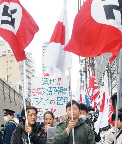 20日是德国纳粹分子阿道夫-希特勒的生日,日本右翼团体成员当天高举象征纳粹的万字旗和旭日升天旗在东京市中心游行。 原标题:希特勒生日日本右翼游行 否认犹太人大屠杀和南京大屠杀 中国日报供本报特稿据韩国《朝鲜日报》4月21日报道,20日是德国纳粹分子阿道夫·希特勒的生日,日本右翼分子当天在街头游行时,不仅打出旭日升天旗,还高举象征纳粹的万字旗。 当天下午,日本“护国志士会”在东池袋中央公园组织50多名右翼分子举行集会。该公园里有处决东条英机等7名日本战犯的巢鸭监狱绞刑架。这些右翼分子中包括穿牛仔裤的20多岁年轻人,还有戴登山帽的70多岁老人。他们对着纪念碑默哀后走上池袋街头游行,名为“实现大东亚共荣圈的国民大游行”。 “大东亚共荣圈”是二战时期日本侵略、抢夺亚洲各国时提出的口号。日本当时以“亚洲应以日本为中心建立共同体应对西方势力”为名美化战争和侵略行为,并将他们挑起的太平洋战争命名为“大东亚战争”。右翼分子当天在集会上主张“为了纪念过去的大东亚共荣圈并惩罚对此不知感谢的韩国和中国,应重新建立大东亚共荣圈”。 集会主办者高木修平说:“为了建立大东亚共荣圈,纪念曾和日本建立军事同盟的纳粹德国是理所当然的事情。” 右翼分子当天在街头游行了40多分钟,不断高呼“纪念希特勒诞辰125周年”“纪念希特勒诞辰125周年”、“应重新验证河野谈话并重新评价纳粹德国”等口号。 游行过程中出现了万字旗、被涂鸦破坏的太极旗,还在韩国总统朴槿惠和日军慰安妇少女相片上写着“乞丐、卖淫女”。日本警察以集会已经申报为由,在游行队伍前面开路。 日本另一个纳粹拥护团体当天举行了纪念希特勒诞辰的宴会。曾担任右翼团体“维新政党-新风”副代表的濑户弘幸最近主张:“赞美希特勒有什么问题?现在还有人相信他大量屠杀犹太人吗?南京大屠杀和日军慰安妇问题一样都是捏造的。” |