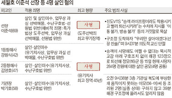 “世越号”船长和船员适用于杀人罪(网页截图) 国际在线专稿:据韩国《中央日报》5月16日报道,“世越号”(原译“岁月号”)包括船长李俊锡在内的15名船员意识到如果组织440多名乘客逃生,自己就要等到最后逃出,所以在未通知乘客进行逃生的情况下抛弃乘客而率先逃生。对于涉嫌未采取乘客救援措施就逃跑的“不作为杀人”嫌疑,李船长陈述道“我只想着无论如何都要救出船员”。 对于李俊锡船长,检方考虑到如果适用最高刑法的杀人罪可能被判无罪,因此还对其追加了最高无期徒刑的弃船逃跑罪。检方对包括一等机关长孙志泰在内的剩下9名船员也适用了遗弃致死、致伤罪,最高可被判处45年的有期徒刑。 联合调查本部负责人对于起诉李船长等4人被适用于杀人罪一事表示,“他们在30多分钟内接到了珍岛管制中心(VTS)发出的‘让乘客们套上救生圈出逃’的命令,却谎称‘船内不能进行广播和移动’,继而在9点37分中断通信率先逃生,构成了杀人罪”。该负责人还补充道“经确认,船员们出逃时的9点38分,当时三层甲板并未进水,如果此时下达出逃的广播通知,那么所有乘客都能被海警或附近的渔船轻易救出”。 检方调查结果显示,事故发生当天上午8点52分,“世越号”船长和8名船员聚集在掌舵室商议率先逃生。当海水浸到两层船高的浸水上限时,他们决定弃船逃离。而船员们清楚地知道推拉式的船舱门浸水后,会因为水压的原因无法开启,但众船员当时往返于自己的舱室拿取衣服或无线对讲机时并没有告知乘客沉船事实,没有启动任何广播设备、紧急按钮、无线对讲机等。船员们完全无视VTS多次下令组织乘客出逃的通信内容,进行虚假通话。据最新调查的结果,部分船员为了更容易被救生艇救出,还把消防水管缠在身上等待救援。 检方还对海洋警察消极的救援活动展开了正式调查,检方表示“今后将对救援负责人进行彻底的调查后严厉问责”。 |