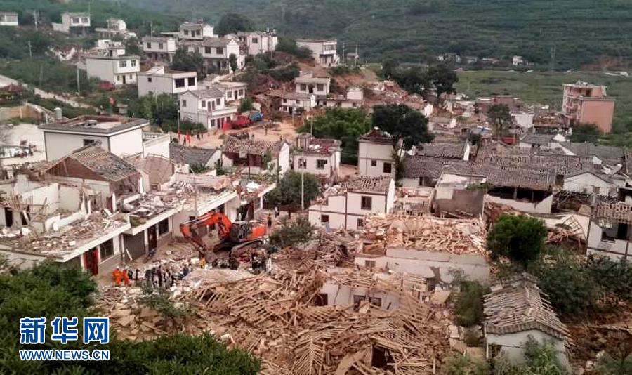 这是8月3日拍摄的云南鲁甸县地震灾区(手机拍摄)。记者从云南省地震局了解到,截至8月3日晚上20时,云南省昭通市鲁甸县6.5级地震已经导致鲁甸县120余人死亡,180余人失踪,1300余人受伤,房屋倒塌12000余间,受损30000余间,灾区交通、电力、通讯全面中断。新华社发