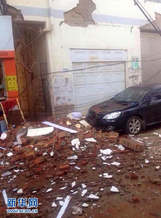 云南昭通市鲁甸县一建筑外墙受地震影响剥落(手机拍摄,8月3日摄)。据国家地震台网测定,北京时间2014年8月3日16时30分,在云南省昭通市鲁甸县(北纬27.1度,东经103.3度)发生6.5级地震,震源深度约12公里。 新华社发