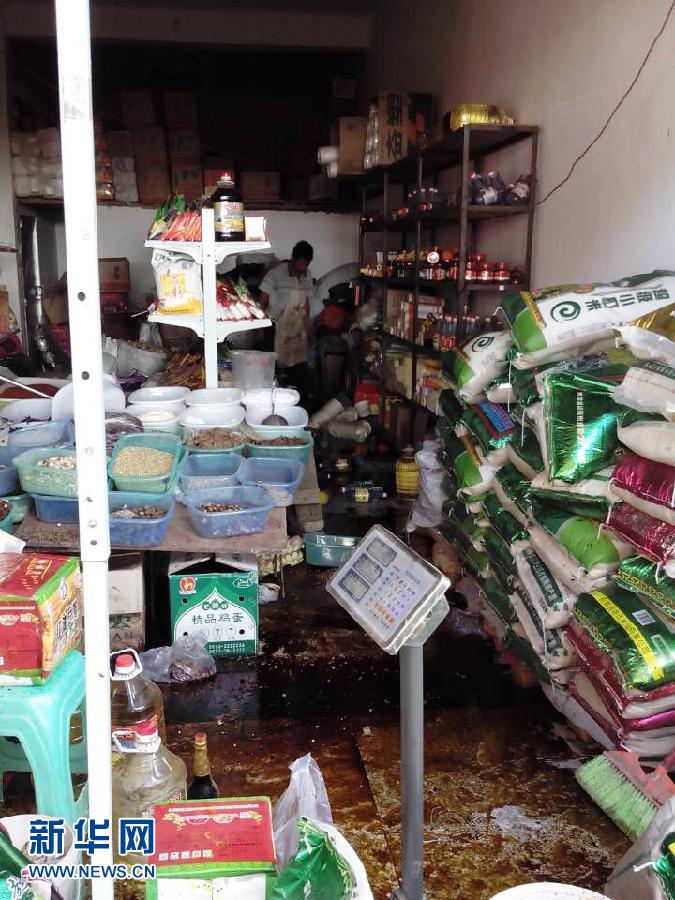 云南昭通市鲁甸县一商铺货架上的商品散落在地(手机拍摄,8月3日摄)。据国家地震台网测定,北京时间2014年8月3日16时30分,在云南省昭通市鲁甸县(北纬27.1度,东经103.3度)发生6.5级地震,震源深度约12公里。 新华社发