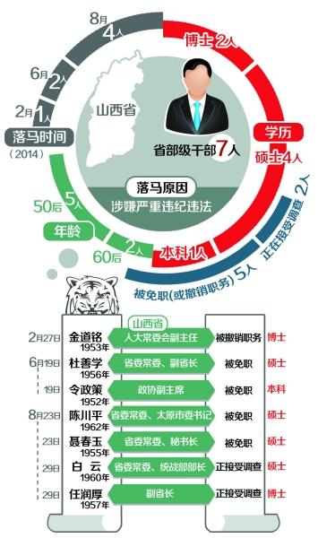 山西三创“一天打两虎”纪录 法制晚报讯(记者 温如军)中纪委分别于昨日17时25分、18时08分、20时13分通报,山西省委常委、统战部部长白云,十二届全国人大环境与资源保护委员会副主任委员白恩培,山西副省长任润厚涉嫌严重违纪违法,目前正接受组织调查。 至此,山西被调查的省部级官员已达7人,其中包括5名在任省委常委。而十八大以来被调查的省部级及以上官员数量,也升至43人。白云还成为十八大以来首个被调查的女性省部级官员。 今天上午,《法制晚报》记者登录山西省人民政府官网,在省政府领导班子一栏显示,副省长班子中,任润厚已被拿下,在“领导活动”一栏中,亦不见任润厚的相关报道。 在山西省统战部的官网上,在显著位置仍保留着白云的足迹。最近一篇报道是《白云会见台湾教师山西古文化之旅参访团》,文章说,8月20日,省委常委、省海外联谊会会长白云在太原会见第17届 “台湾教师山西古文化之旅”参访团。 而在全国人大官网上,环境与资源保护委员会里,有14位副主任委员,白恩培位列第二。 山西已有7省部级被拿下 中央今年重拳整治山西官场,已经有7名在职省部级干部落马。 2014年2月27日,山西省人大常委会副主任金道铭被中央调查(彼时为山西省委常委)。 2014年6月19日,中纪委同时通报山西两名省部级干部被查,包括时任山西省委常委、副省长杜善学,时任山西省政协副主席令政策。 2014年8月23日,中央纪委监察部网站再次接连公布,山西省委常委、秘书长聂春玉,山西省委常委、太原市委书记陈川平均涉嫌严重违纪违法。 2014年8月29日,中纪委在短时间内第三次通报山西两名省部级干部被调查,包括山西省委常委、统战部长白云和山西省副省长任润厚,两人涉嫌严重违纪。 至此,山西被调查的省部级官员已达7人,其中包括4名在任省委常委。十八大以来的高压反腐,虽引发多地官场地震,但一天之内一地两名省部级官员同时被调查的并不多。唯有山西,三创“一天打两虎”纪录。 |