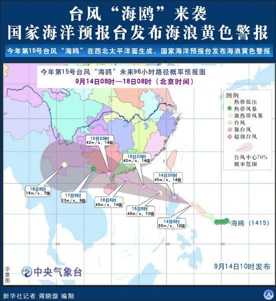 - [ 09-14]中央气象台发布台风黄色预警 “海鸥”强度将加强