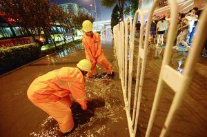 昨晚暴雨过后,大望桥下积水,排水工人紧急排水。首席摄影记者 吴宁/摄