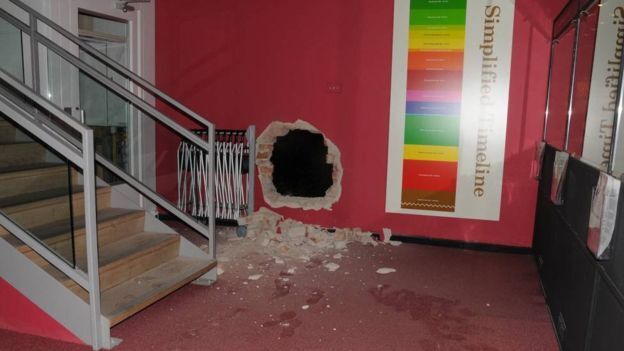 窃贼在杜伦大学东方博物馆的墙壁上打开一个大洞(图片来源:杜伦警察局) 【环球网报道 记者张骜】据英国广播公司(BBC)3月1日报道,英国伯明翰刑事法院2月29日判定4名男子参与策划从英国博物馆盗窃中国文物罪名成立,至此,该犯罪团伙14名成员最终全部被定罪。 2012年4月5日,英国杜伦大学东方博物馆内两件中国文物被盗,失窃文物是一只碧玉云龙纹洗和一件德化瓷雕,均为中国清代艺术品,价值近200万英镑。窃贼随后把这两件艺术品藏在一个垃圾场,但是忘记了藏匿的具体位置。通过努力,杜伦大学东方博物馆最终找回了失窃的艺术品。