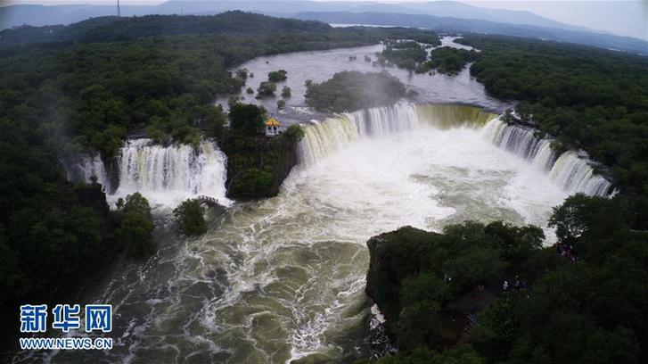 这是7月17日在黑龙江省牡丹江市镜泊湖景区内拍摄的吊水楼瀑布(航拍照片)。受近期降雨影响,黑龙江省牡丹江市镜泊湖景区湖水大幅上涨,吊水楼瀑布出现“三面飞瀑”的壮观景象。新华社发(张春祥 摄)