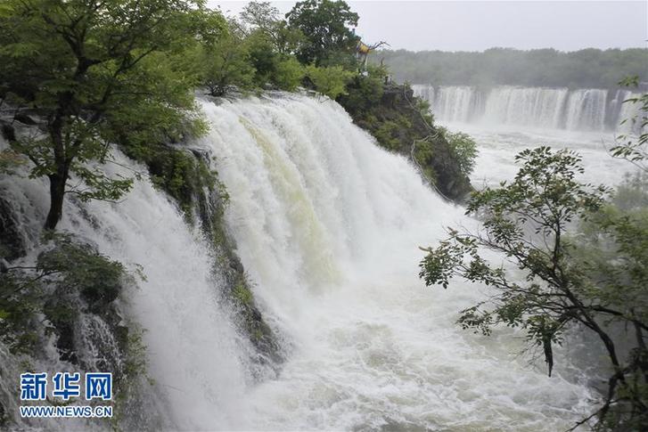 这是7月17日在黑龙江省牡丹江市镜泊湖景区内拍摄的吊水楼瀑布。受近期降雨影响,黑龙江省牡丹江市镜泊湖景区湖水大幅上涨,吊水楼瀑布出现“三面飞瀑”的壮观景象。新华社发(张春祥 摄)