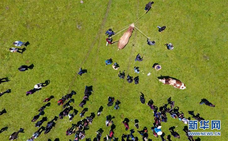 7月17日,在四川省凉山彝族自治州昭觉县,两头公牛在场上争斗。当日,四川省凉山彝族自治州的彝族群众欢度一年一度的传统节日“火把节”。斗牛比赛是“火把节”的传统项目,也是“火把节”最吸引观众的一大赛事。参赛的公牛被牵到一起进行顶力和耐力较量,争斗场上精彩纷呈。新华社记者薛玉斌 摄