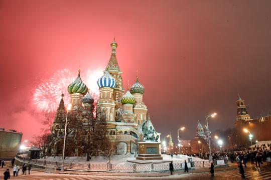 这是2013年1月1日,俄罗斯首都莫斯科红场上空燃放烟花,庆祝新年。新华社记者姜克红摄