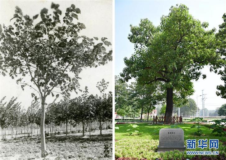 左图为时任兰考县委办公室通讯干事刘俊生1967年拍摄的焦桐,右图为2017年8月9日新华社记者冯大鹏拍摄的焦桐(拼版照片)。