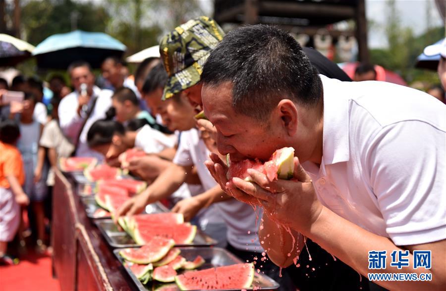 8月19日,在贵州省丹寨县万达小镇,游客参加吃西瓜比赛。