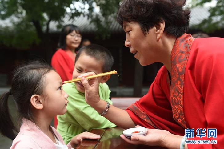 8月22日,一位老师在一名孩子的头部点朱砂。
