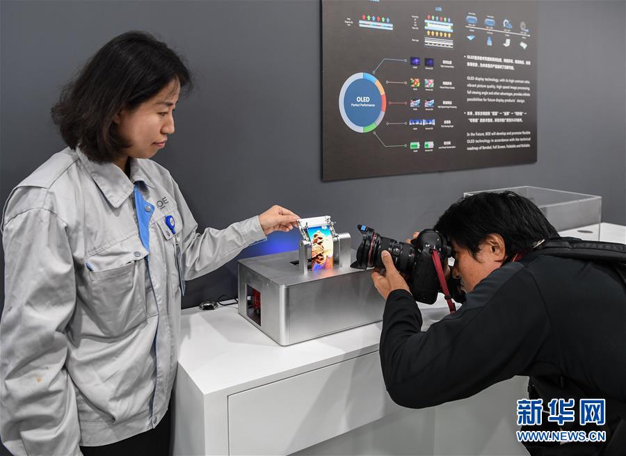 日本《读卖新闻》记者安川纯(右)在京东方科技集团股份有限公司的展示厅拍摄展品(10月13日摄)。中国共产党第十九次全国代表大会10月18日将在北京召开。从12日开始十九大新闻中心组织包括科技文化创新在内的15条线路的采访活动,让中外记者近距离了解中国、了解中国共产党。新华社记者申宏 摄
