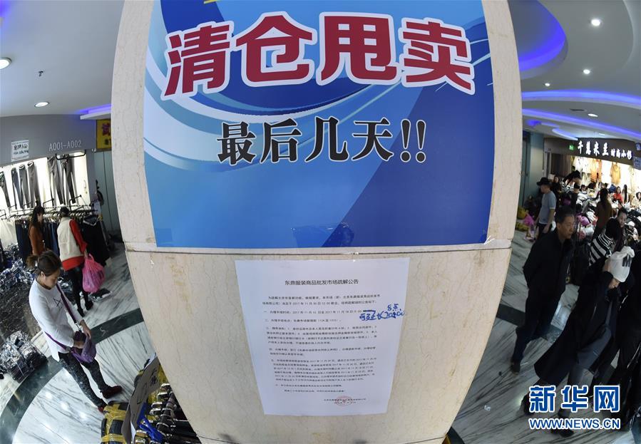 11月17日,东鼎市场内部张贴着的疏解公告。据了解,位于北京“动批”商圈的最后一处营业的服装批发市场——东鼎市场(北京东鼎服装商品批发市场有限公司)将于2017年11月30日中午12时歇业,届时“动批”商圈疏解工作将全部完成。新华社记者罗晓光 摄