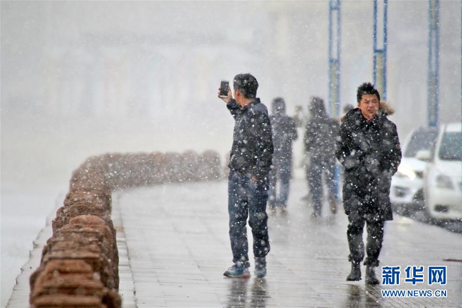 11月18日,在山东烟台滨海北路,行人在风雪中拍照。当日,受强冷空气影响,山东烟台迎来今年入冬首场降雪。 新华社发(唐克 摄)