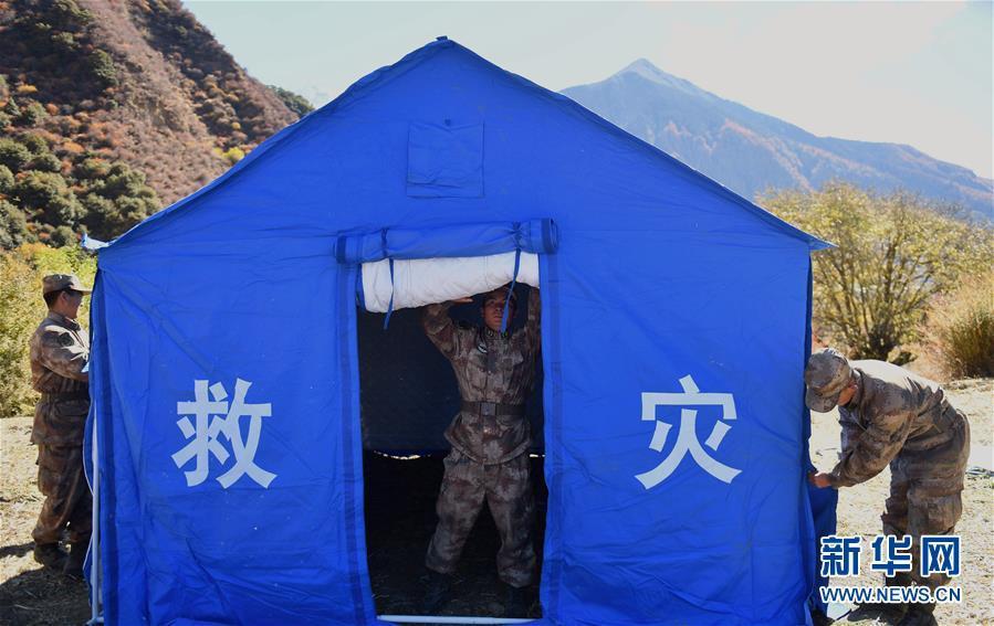 解放军战士在受灾较为严重的林芝市米林县直白村搭建帐篷(11月18日摄)。 11月20日,记者从西藏林芝市了解到,林芝“11·18”地震后,党政军警民协同作战,林芝已设立临时集中安置点49个,搭建帐篷505顶,并配备防潮垫、手电筒、应急灯等附属设备,对房屋存在安全隐患的2000多名群众进行了集中安置。新华社记者晋美多吉 摄