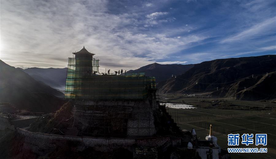 施工人员在雍布拉康进行维修保护作业(11月16日摄)。近日,西藏第一座宫殿——雍布拉康开始进行全面维修保护。据介绍,由于雍布拉康木构件腐朽,建筑墙体多处开裂,基础下沉同时建筑本体出现多处险情,有关部门根据修旧如旧的原则对其进行全面保护和维修,工程预计明年4月完工。雍布拉康位于西藏山南市乃东区泽当镇东南的扎西次日山上,据史书记载始建于公元前2世纪。1962年,雍布拉康被确定为西藏自治区级文物保护单位。新华社记者普布扎西 摄
