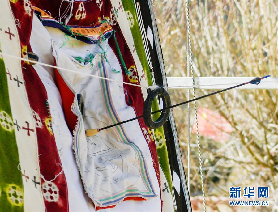 11月19日是西藏林芝市工布新年大年初一,林芝市各地都举办了丰富多彩的节庆活动,工布响箭便是其中的特色之一。工布响箭箭头由一个刻有小孔的木质圆锥体组成,箭射出后,通过空气摩擦原理,箭头会发出响亮的口哨声,“响箭”因此而得名。在赛场另一边,挂着一张拦截响箭用的布帘,其前方悬挂一个三圈环形组成的皮质靶心,射中后,靶心内圈随箭脱落。2007年,“林芝工布响箭”被列入第二批西藏自治区非物质文化遗产名录。这是在西藏林芝市巴宜区鲁朗镇东巴才村举行的射响箭比赛上,一支响箭正中靶心(11月19日摄)。 新华社记者晋美多吉摄