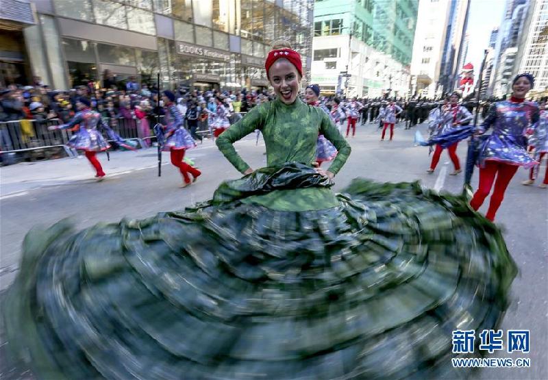 11月23日,在美国纽约感恩节大游行上,一名演员在游行队伍中表演。