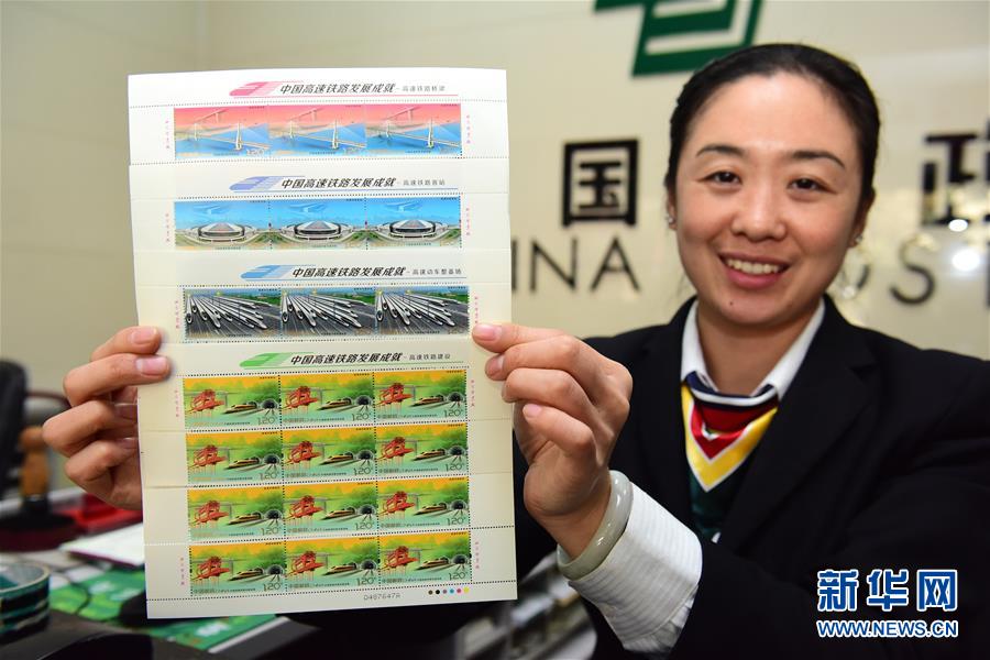11月25日,中国邮政集团公司河北省新乐市分公司工作人员展示《中国高速铁路发展成就》纪念邮票。当日,中国邮政发行《中国高速铁路发展成就》纪念邮票1套4枚,小型张1枚。图案内容分别为:高速铁路建设、高速动车整备场、高速铁路桥梁、高速铁路客站,小型张内容为“复兴号”动车组。全套邮票面值为10.80元。新华社发贾敏杰 摄