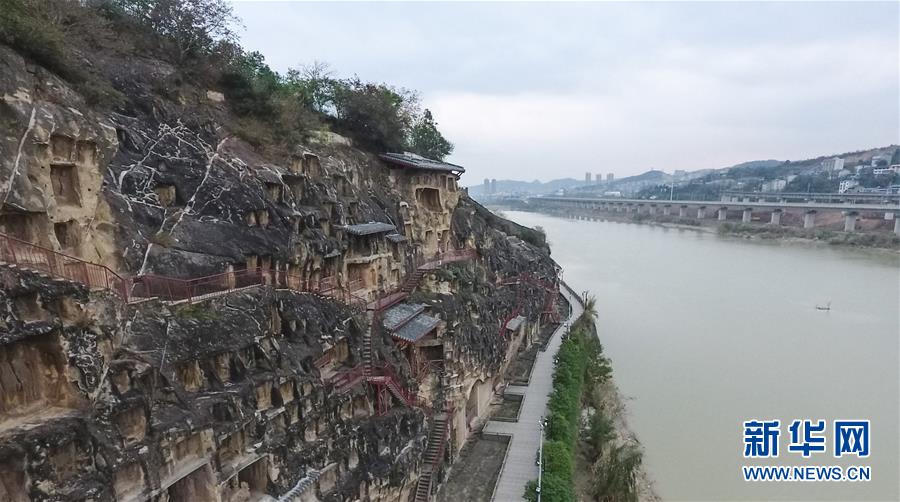 11月24日在四川省广元市拍摄的千佛崖景区。即将开通的西成高铁是我国首条穿越秦岭的高速铁路,设计速度为每小时250公里。高铁自北向南穿越关中平原、秦岭山脉、汉中平原、巴山山脉进入四川盆地,计划于今年年内开通运营。届时,高铁将串连起西安、汉中、广元、成都等古城和众多旅游景点。新华社记者薛玉斌摄