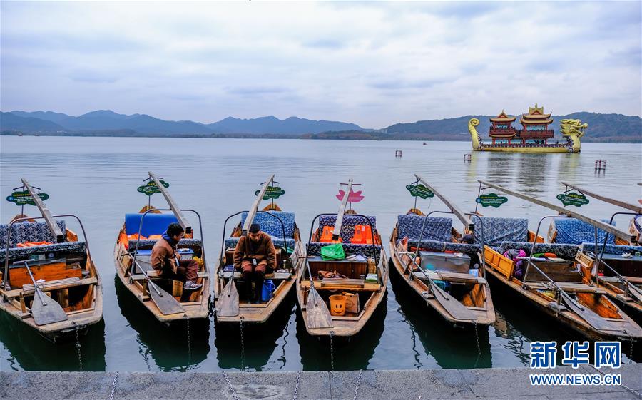 西湖边等待游客的手划船(12月13日摄)。