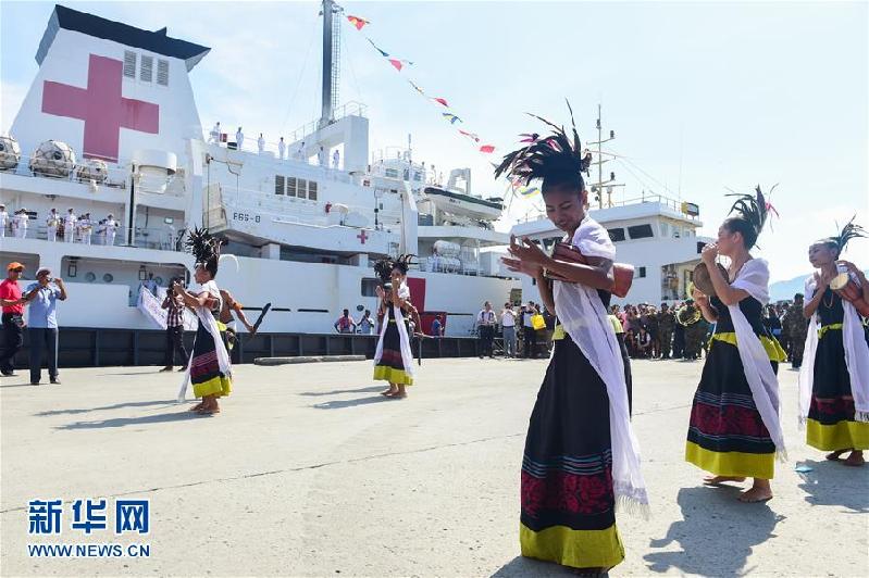 12月14日,在东帝汶帝力港码头,身着当地传统服饰的舞蹈演员欢迎和平方舟医院船的到来。
