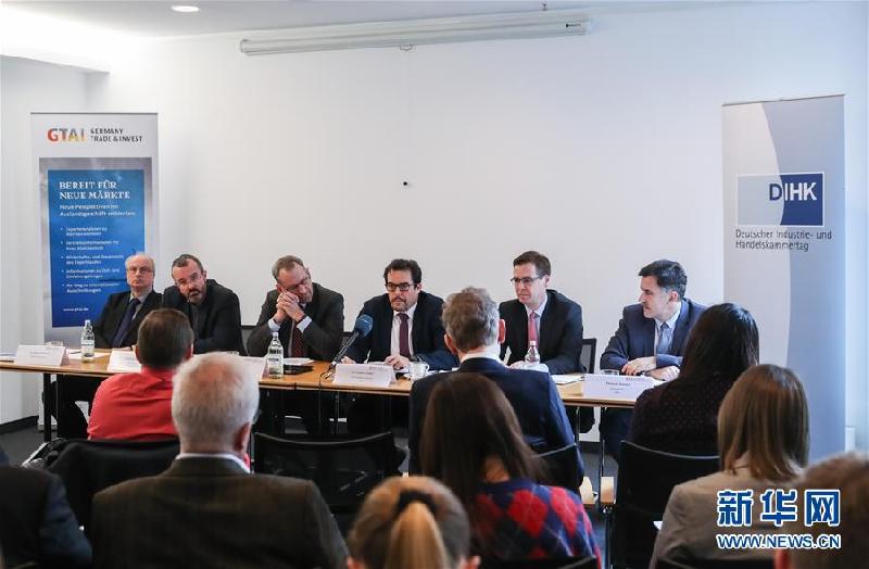 这是2月26日在德国首都柏林拍摄的德国联邦外贸与投资署和德国工商大会研究报告发布会现场。当日,德国联邦外贸与投资署和代表德国企业界的德国工商大会联合发布《新丝路——中国的大规模投资项目》研究报告。报告说,中国提出的“一带一路”倡议为德国企业创造了巨大机遇。新华社记者单宇琦摄 |