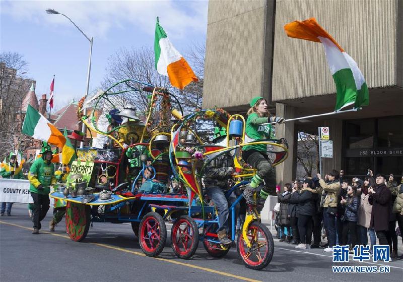 这是3月11日在加拿大多伦多圣帕特里克节游行中拍摄的一辆花车。 当日,加拿大多伦多举行2018年圣帕特里克节游行,吸引成千上万市民身着绿色服饰沿途观看。每年3月17日的圣帕特里克节是爱尔兰传统节日,为纪念爱尔兰守护神圣帕特里克而设立。新华社发(邹峥摄) |