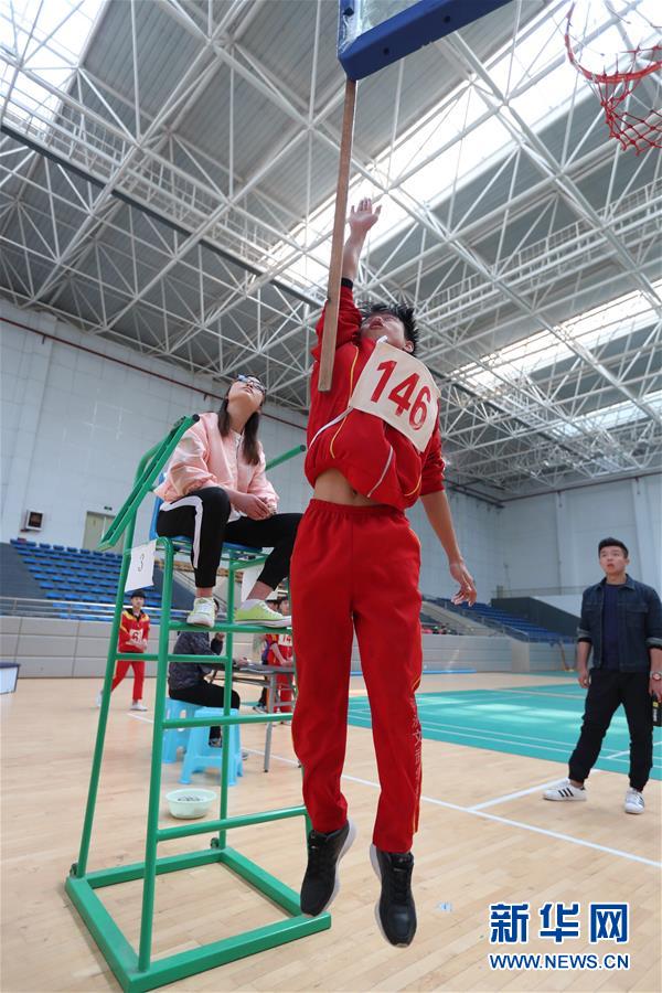 4月2日,来自贵州省铜仁市的运动员腾锤(中)在进行原地摸高测试。当日,2018极限运动国家集训队直通车贵州省跨界跨项选材在贵州医科大学举行。来自全省各地的数十名极限运动人才参加了选拔。新华社记者刘续摄