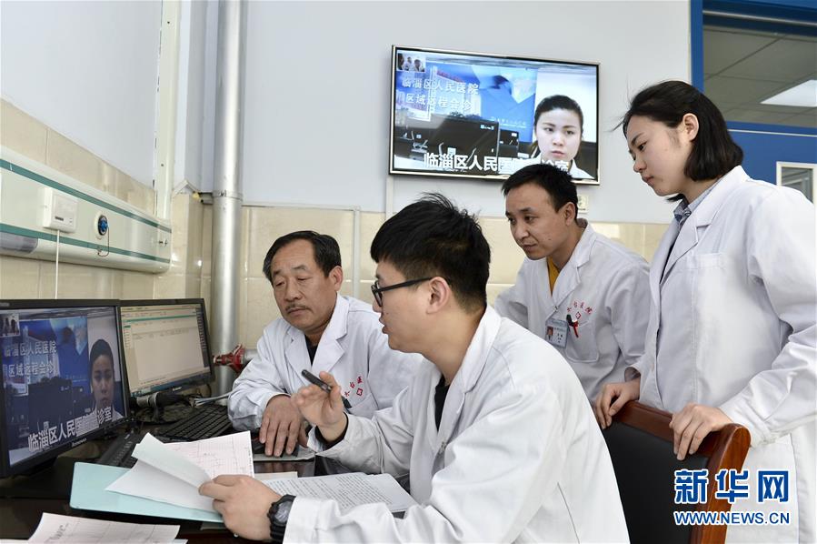 在山东省淄博市临淄区人民医院朱台分院影像远程会诊中心,医生通过远程会诊系统与临淄区人民医院的医生共同为患者诊断病情(2017年3月15日摄)。新华社记者郭绪雷 摄