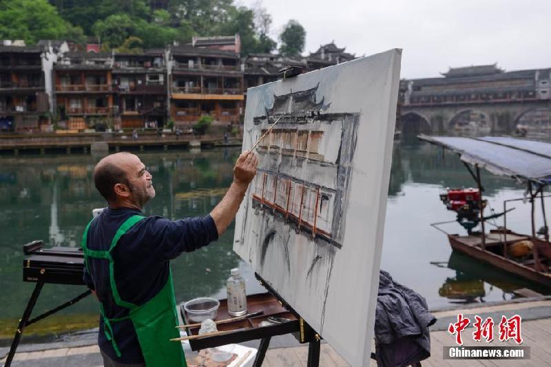 4月12日,参加“跨文化视野中的意大利当代艺术展”的意大利艺术家来到湖南凤凰古城沱江河畔,用手中的画笔描绘古城,以此助推中意艺术文化交流。中新社记者杨华峰 摄 |
