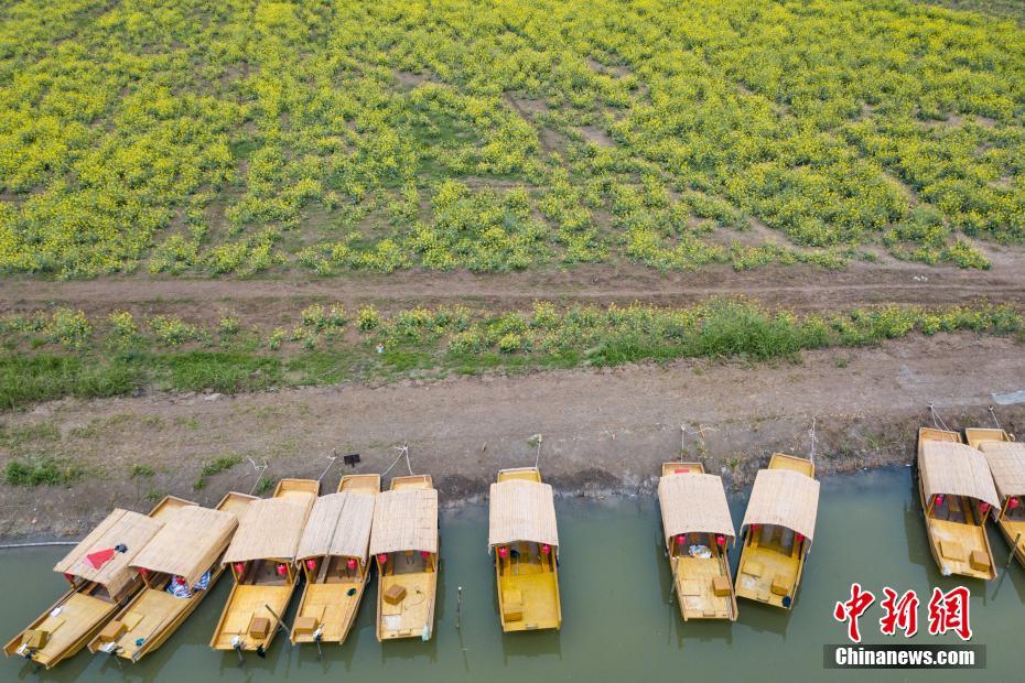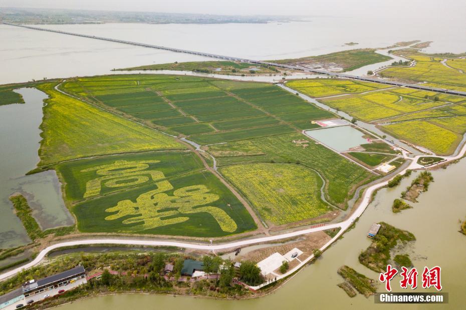 4月16日,航拍江苏高邮湖郊野公园内盛开的油菜花,田间“高邮”二字和盂城古驿站、明清南门、唐镇国寺塔等当地历史文化古迹等图案格外醒目。高邮地处长江三角洲的江苏省中部、里下河西缘,土地肥沃,物产丰富,素有“鱼米之乡”之称。中新社记者 泱波 摄