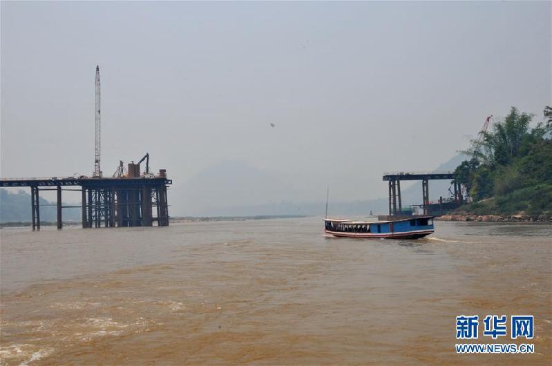 这是4月14日在老挝琅勃拉邦拍摄的中老铁路琅勃拉邦特大桥的修建现场。在老挝琅勃拉邦城北崇山峻岭和急水湍流间,中铁八局中老铁路第三标段三分部负责建设的一跨湄公河的班那汉特大桥和二跨湄公河的琅勃拉邦特大桥正在加紧建设。中老铁路北起中老边境,南抵老挝首都万象,全线采用中国技术标准、使用中国设备,2016年12月全线开工。线路全长414公里,建设总工期5年。新华社记者章建华摄