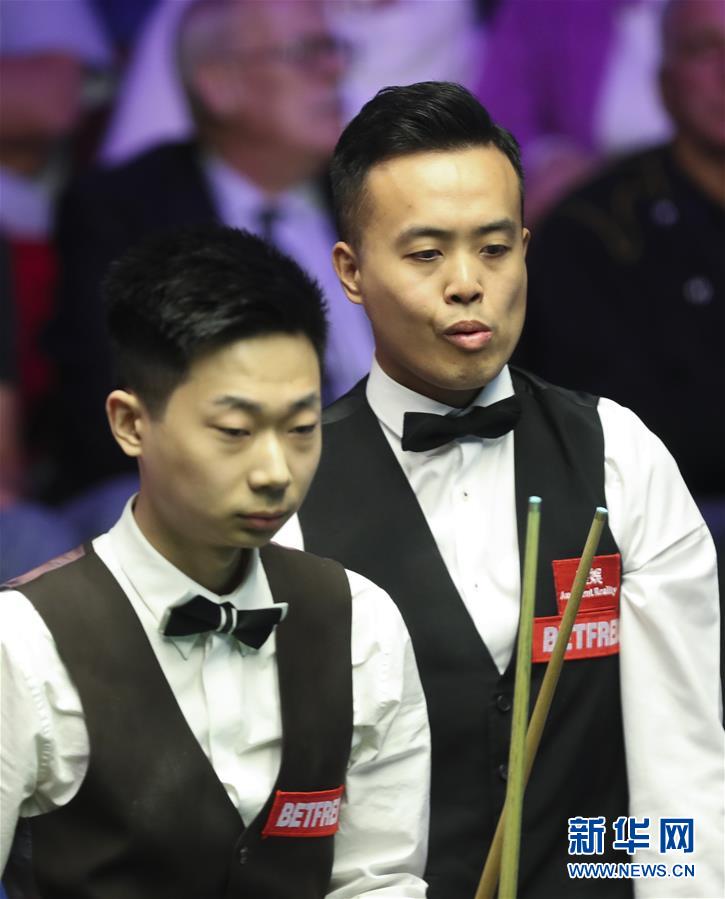 4月22日,傅家俊(右)与吕昊天在比赛中。当日,在英国谢菲尔德克鲁斯堡剧院进行的2018年世界斯诺克锦标赛首轮比赛中,中国选手吕昊天以10比5战胜中国香港选手傅家俊,晋级第二轮。新华社记者韩岩摄