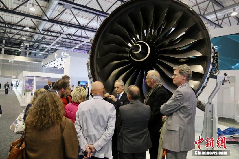 图为4月27日,参展单位负责人向客商介绍飞机涡轮。中新社记者 郭泰 摄