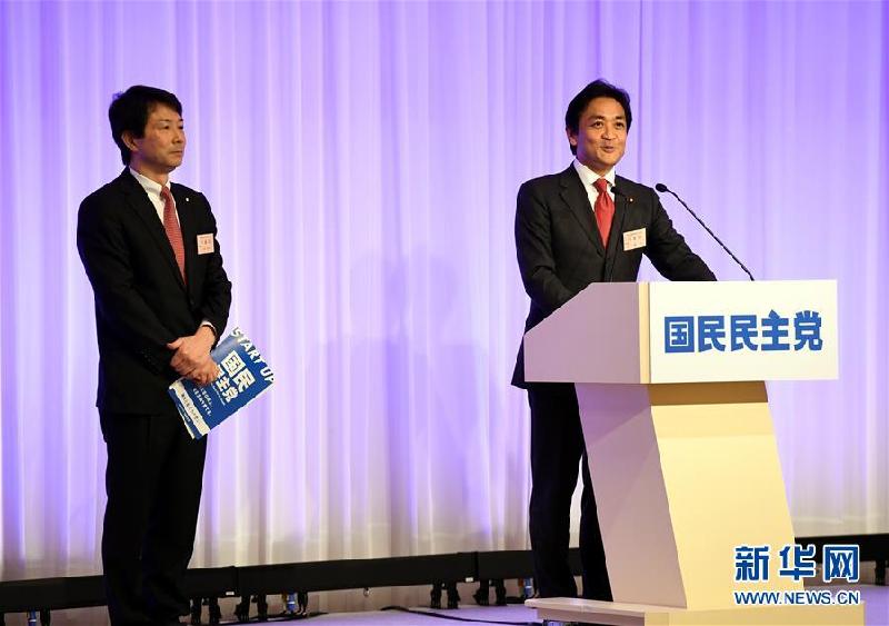 5月7日,日本在野党希望之党党首玉木雄一郎(右)在东京举行的国民民主党建党大会上讲话。