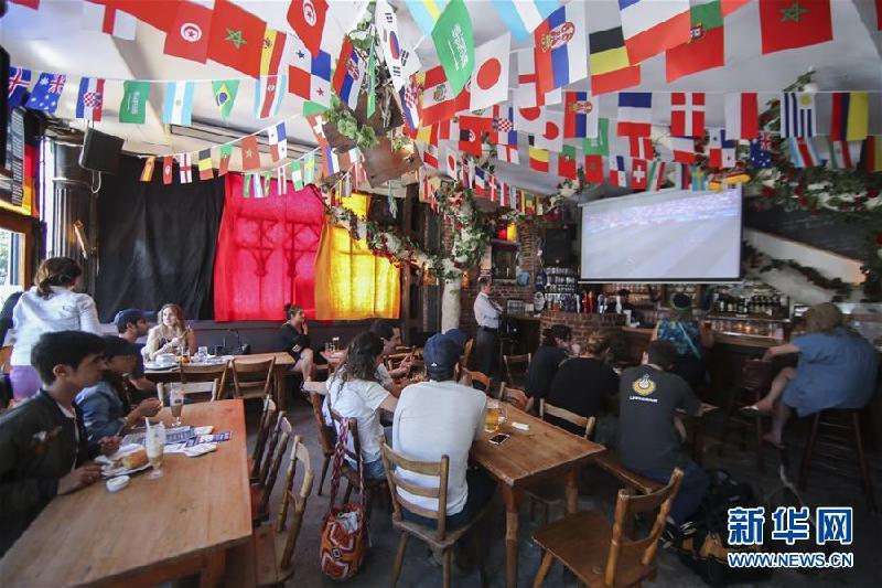 6月14日,人们在美国纽约曼哈顿下城的一家足球主题酒吧观看球赛直播。当日,第21届世界杯足球赛在俄罗斯首都莫斯科开幕。为抓住世界杯商机,纽约不少酒吧和餐厅在店内外增添了世界杯相关装饰,设置大屏幕直播球赛,并延长了白天的营业时间以迎合球迷看球的需求。新华社记者王迎 摄 |