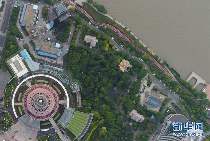 这是2017年5月14日无人机拍摄的陆家嘴绿荫掩映的河边步道。