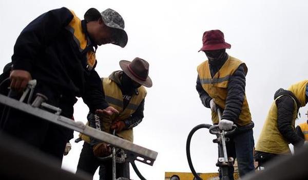 6月30日,青藏铁路唐古拉站附近,青藏集团公司格尔木工务段唐古拉线路车间养路工人在大雨来临前抓紧对路轨进行捣固作业。