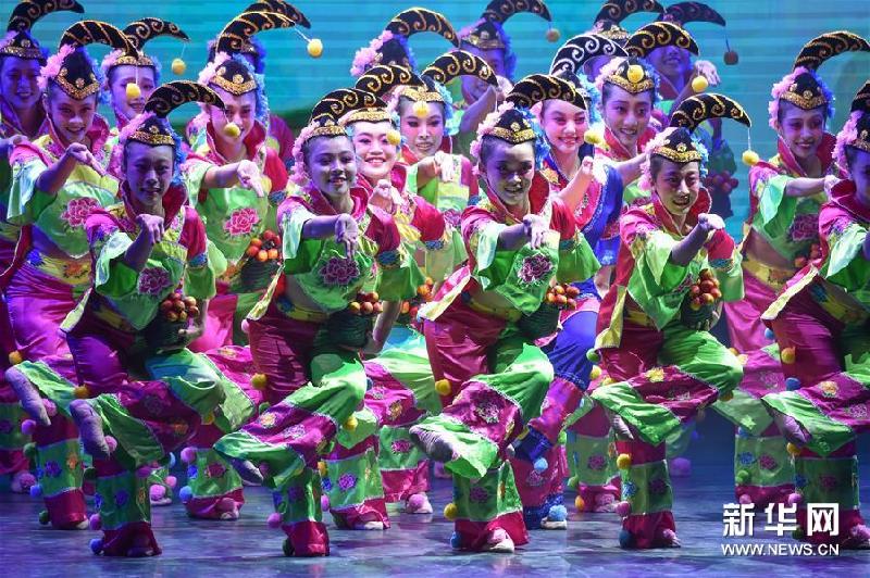 7月4日,在福建师范大学,台湾台中市文华高级中等学校学生在表演群舞《荔枝红了》。当日,第七届海峡两岸青年舞蹈嘉年华开幕式暨海峡两岸青少年优秀舞蹈展演在福建省福州市举行。该活动由福建省文联、福建省舞蹈家协会主办,近千名两岸青少年舞者参加。新华社记者 宋为伟 摄