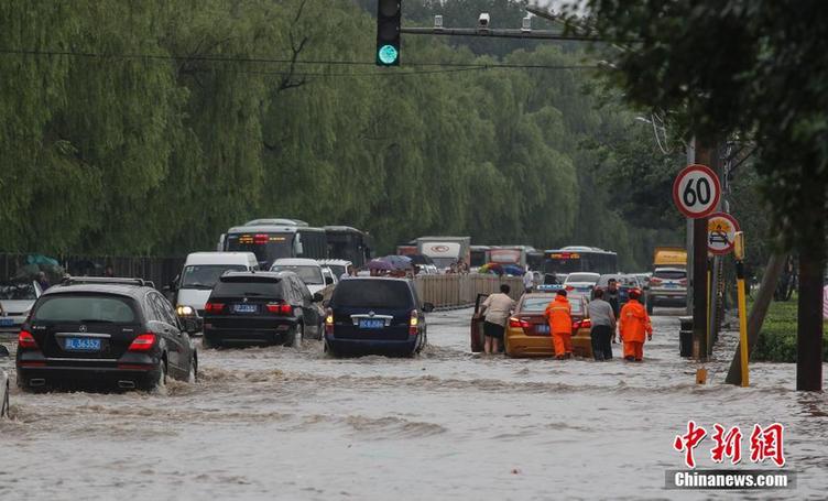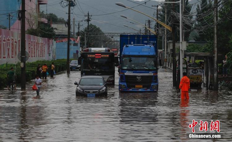 7月9日下午,北京市海淀区突降暴雨,黑龙潭路附近积水严重。当日,北京石景山区、门头沟区、海淀区等5区气象台分别发布暴雨蓝色、黄色预警信号。中新社记者贾天勇 摄