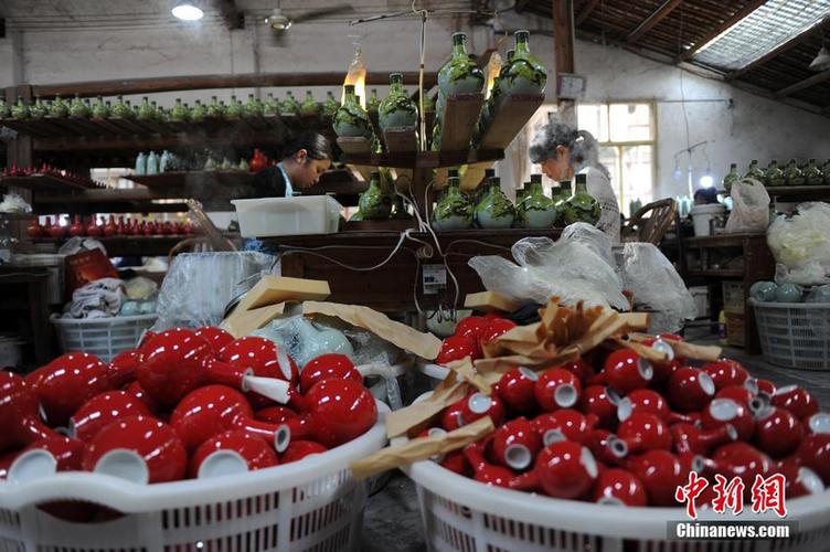 两名工作人员正在对定制酒瓶进行贴标。中新社记者刘冉阳 摄