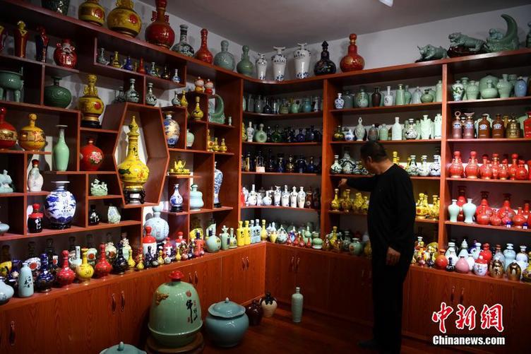 店家正在介绍展示的各类酒瓶。中新社记者 刘冉阳摄