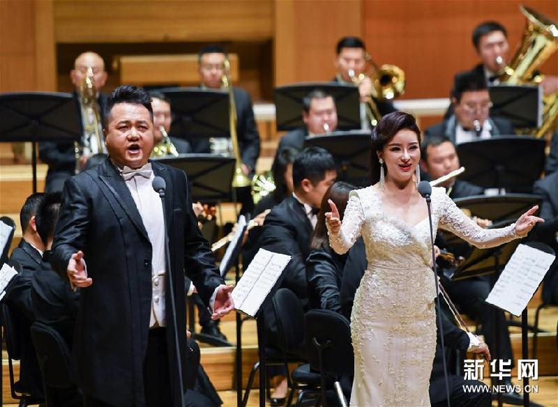 1月9日,歌唱演员陈苏威(前左)和毛一涵在音乐会上演唱。新华社记者陈晔华摄