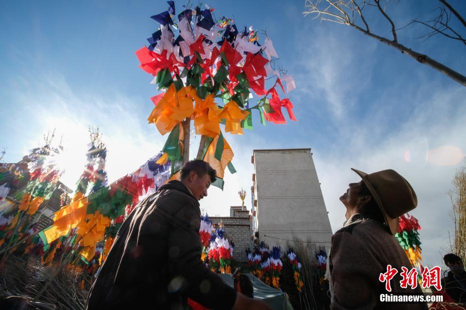 1月19日,一棵完成缝制的五彩经幡树。五彩经幡树是藏族民众在藏历新年前必备的年货之一。藏历新年期间,藏族民众每家每户会选择一个良辰吉日,为自家的房顶更换五彩经幡树,祈求新的一年里五谷丰登,吉祥如意。中新社记者何蓬磊 摄